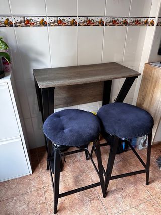 mueble de cocina plegable, color madera oscuro con ambos taburetes. Mesa alta, como nueva. Se pliega perfectamente cerrado mide de profundidad 42, abierta la mesa son 80cm