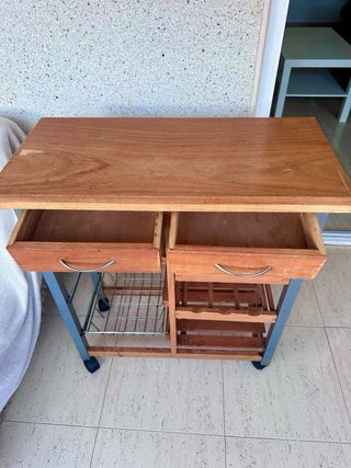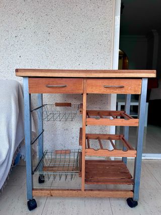 Mueble auxiliar portátil para cocina con estructura de metal y detalles en madera. - Dos cajones superiores. - Dos cestas metálicas. - Estantes de madera para botellas y otros utensilios. - Ruedas para facilitar su movilidad. 81x72x34