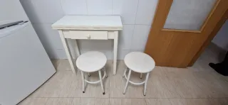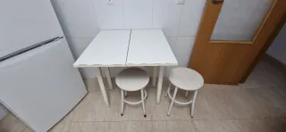 Conjunto de mesa de cocina con un diseño moderno y dos sillas a juego. - Mesa con sobre de madera y estructura blanca. - Sillas de plástico blanco. La medida de la mesa es 100cm pudiéndose desplegar ambos lado y convertirla en una mesa de 161 cm También cuenta con pequeño cajón la parte central La altura es de 75cm Y la anchura de 60 cm