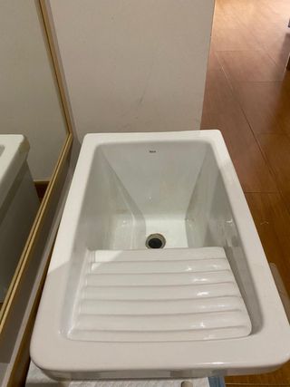 Pila de lavadero de cerámica con un diseño funcional. - Superficie con estrías para facilitar el lavado. - Desagüe central.