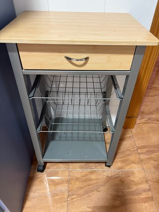 Carrito auxiliar para cocina con superficie de madera y estructura metálica. Ancho 47 Fondo 36 Alto 76 - Cajón frontal con tirador. - Dos cestas metálicas. - Ruedas para fácil movilidad.