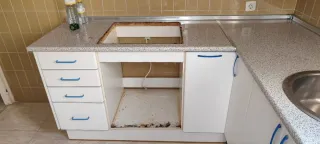 Se vende conjunto de muebles de cocina en muy buen estado. Ha sido desmontado con mucho cuidado. También se encuentra la encimera en perfecto estado para montar