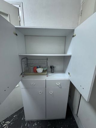 URGE POR REFORMA Muebles de cocina en buen estado. Ya está desmontada (separado por módulos) Las puertas están pintadas. Bien conservadas. Encimera de granito (creo 🙃). Se rompió por la parte del fregadero. Pienso que se puede re-instalar fácilmente A parte ,placa vitrocerámica (balay) (50€) y campana extractora (cata) (70€)