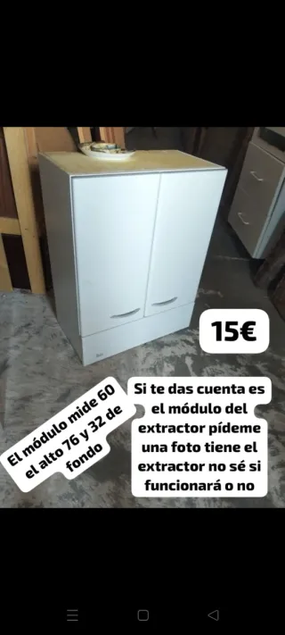 Módulo de cocina con extractor. - Alto: 76 cm - Ancho: 60 cm - Fondo: 32 cm - Precio: 15€ - Se puede pedir foto del extractor para verificar su funcionamiento.