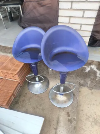 Conjunto de dos taburetes altos, perfectos para tu barra o cocina. Para restaurar. - Asientos de plástico en color azul. - Base y pie de metal plateado. - Reposapiés circular.