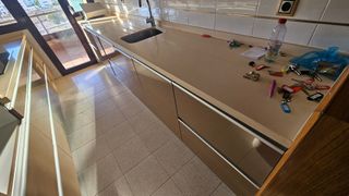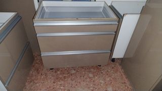 Conjunto de muebles de cocina en tonos beige y marrón. - Combinación de madera y metal. - Diseño moderno y funcional. Se vende cocina sin electrodomésticos. Muebles de marca. También los paneles para enpanelar frigorífico y congelador. Interesados por privado 1. Mueble semitorre 45x90x 60 2. Mueble semitorre 45x 53x60 3. Escobero 142 x 53x60 4. Cajonera con 5 cajones y cubiertos, .....60x72,5x60 5. Semitorre horno microondas con cajón 25x 60x60 6. Mueble bajo 24,5x73x60 7. Cajonera y gaveta de 60x73x60 8. Mueble bajo 45x73x60 9. Mueble bajo 45x73x60 10. Rinconera baja 30 x 73x 60 11. Especiero 29,5x73x60 12. Mueble debajo vitro