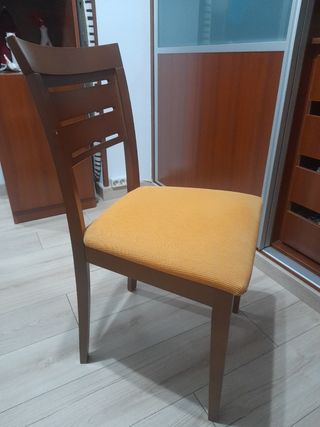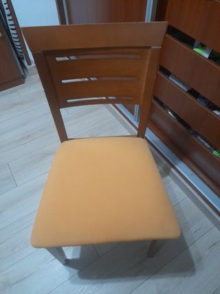 Se vende 4 preciosas sillas de madera con un asiento de tela color naranja. Está en muy buen estado. - Diseño sencillo y elegante. - Perfecta para comedor o cocina. - Asiento cómodo y acolchado. Precio individual, preguntar conjunto sin compromiso.
