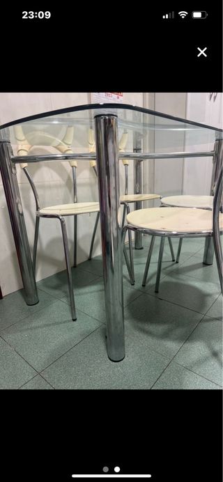 Preciosa mesa de comedor de cristal transparente con estructura metálica plateada. Incluye cuatro sillas con asientos de color beige claro. La mesa tiene un diseño moderno y elegante, ideal para espacios pequeños. - Perfecta para un apartamento o cocina. - Diseño moderno y funcional. - Estructura resistente y estable. - Ideal para 4 personas.