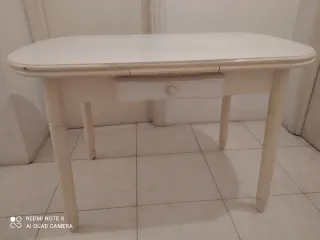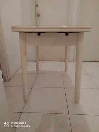 Mesa de cocina con un diseño elegante y funcional. Perfecta para el día a día. - Acabado en blanco brillante. - Cajón integrado para almacenamiento. - Patas de madera robustas.largo,120,abierta las dos hojas,180, altura,78, ancho,70.T.F .661150941