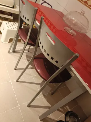 Conjunto de mesa de cocina con sobre de cristal rojo ferrari y estructura de aluminio. Las patas son desmontables 4 sillas a juego 70 x 120cm En perfecto estado A recoger en escalona ( Toledo ) es necesario venir y poder cargarla. Está en un chalet - Diseño moderno y funcional. - Patas de metal resistentes. - Tablero de cristal brillante.