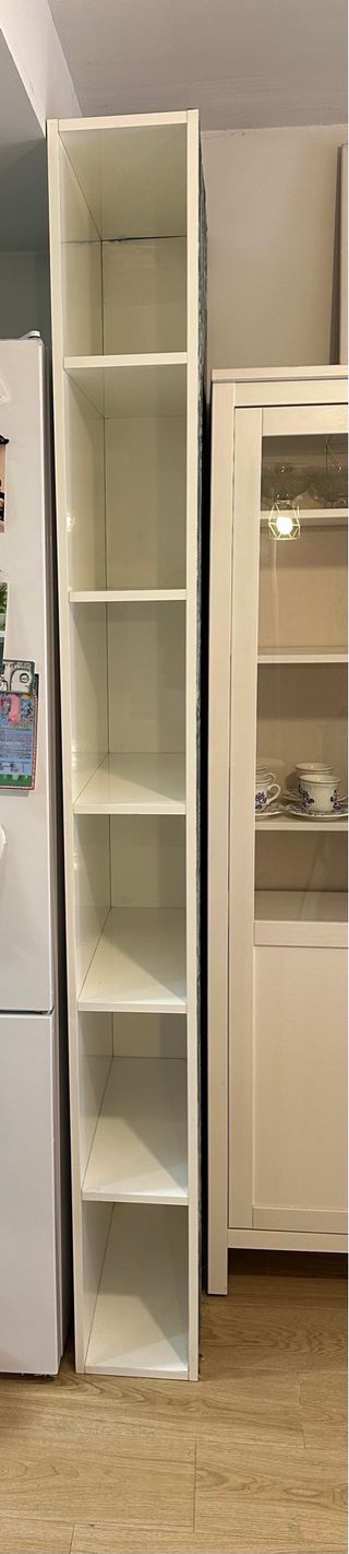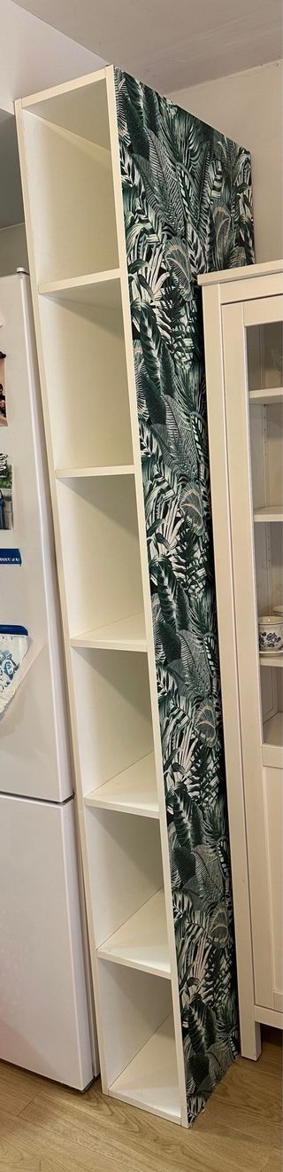 Es un mueble que se diseño a medida para colocarse entre una nevera y otro mueble. Es muy robusto, muy buena madera. Lo empapelé por un lateral porque no estaba acabado para que eso estuviera a la vista pero se puede reempapelar
