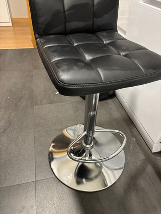 Conjunto de 4 taburetes de cocina con un diseño moderno y elegante. - Asiento acolchado para mayor comodidad. - Base y estructura metálica. - Tapicería de polipiel. - Altura regulable. El precio es por las 4, se vende en conjunto y no por separado.