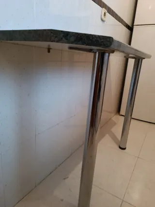 Elegante mesa de cocina con un diseño contemporáneo. - Encimera con acabado en piedra. - Patas metálicas pulidas.