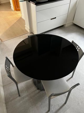 Conjunto de mesa y sillas en buen estado, ideal para comedor, cocina. Diseño limpio, robusto y muy fácil de limpiar. • Mesa: Tablero redondo en acabado negro brillante (efecto cristal/lacado) con pie central metálico en color gris mate. • Sillas (4 unidades): Estructura metálica gris a juego con la mesa. Asiento en color blanco/gris claro y respaldo con detalle geométrico calado. • Estado: Muy bien cuidado, sin desperfectos graves. • Medidas: 90cm
