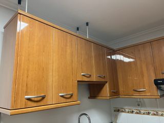 Conjunto de mobiliario de cocina en buen estado. Los muebles, altos y bajos, combinan acabados en madera y detalles plateados. - Muebles de formica altos y bajos, tal y como se ve en la foto. - Tiradores en acabado plateado. - Electrodomésticos no incluidos (se puede negociar).