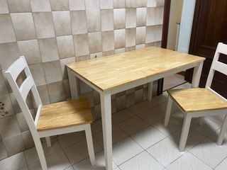 Conjunto de mesa y dos sillas para cocina o comedor. La mesa tiene un tablero de madera clara y patas blancas. Las sillas son blancas con asiento de madera. - Medidas mesa: 114x75x68 - Medidas sillas: hasta el asiento 44; hasta arriba 89; profundidad 40; ancho 37,5 En perfecto estado. No se entrega desmontado.