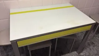 Mesa plegable de IKEA. Tiene marcas y desgaste del uso pero se puede usar sin problema, es solamente estético. Tiene cajones por ambos lados de la mesa.