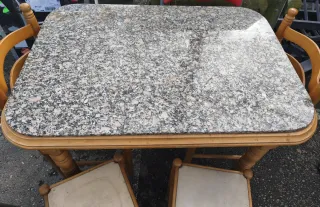 Conjunto de mesa de cocina con encimera de piedra y cuatro sillas de madera, dos sillas y Dos butacas. - Mesa con cajón. - Sillas con asiento tapizado. Posibilidad de transporte.