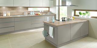 Conjunto de muebles bajos de cocina lineal, listos para instalar. - Incluye pica y grifería. - Vitrocerámica integrada. - Acabado en madera clara y detalles plateados. - Campana.