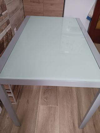 Mesa de cocina con superficie de cristal y estructura metálica. A estrenar. A recoger en Blanes, si se envía portes al cliente. - Diseño moderno y elegante. - Acabado transparente y gris.