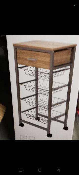 Mesa carro auxiliar de cocina. Cesta espaciosa, balda inferior, cajonera, toalleros en ambos lados y ruedines (los dos delanteros con freno). Base de la mesa: 60'5 x 60'5cm Altura: 89cm ------------------ Frutero verdulero botellero tocinero carrito isla islote mesa juego rana