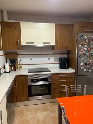 Conjunto de muebles de cocina con acabados en madera, con encimera. - Muebles superiores e inferiores. - Cajones y puertas de almacenamiento. - Encimera Se vende por reforma