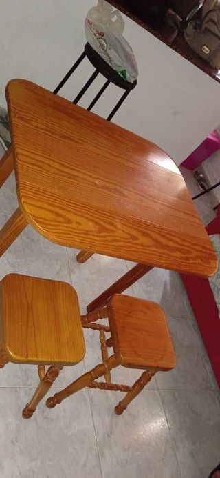 Mesa de cocina de madera con dos sillas y dos tabuetes .Se puede abrir y cerrar las hojas de la mesa al gusto para hacerla más pequeña