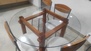 Conjunto de mesa de cocina con tapa de cristal y cinco sillas a juego. - Mesa redonda con superficie de cristal. - Estructura de madera para la mesa. - Cinco sillas con asientos blancos y respaldos de madera.