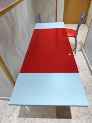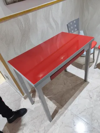 Mesa extensible - Encimera de cristal en color rojo. - Patas de metal en color gris. - Medidas 80x40. Alas extensibles laterales ancho de 78cms