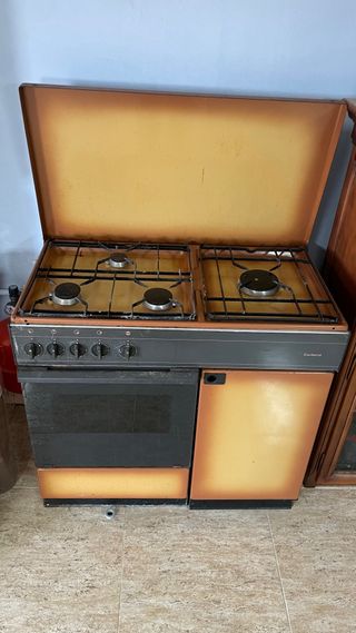 Cocina de gas con horno y tapa superior. - Encimera con cuatro quemadores. - Mandos frontales. - Puerta de horno con cristal.
