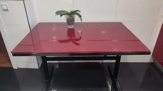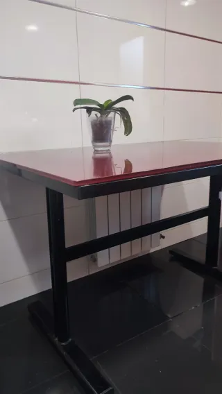 Mesa de cocina con un diseño moderno y robusto. - Encimera de cristal en color burdeos. - Estructura y patas de metal negro. - Bastante bien conservada aunque con signos de desgaste. ** Para recoger entre el 20 de diciembre y el 4 de enero**