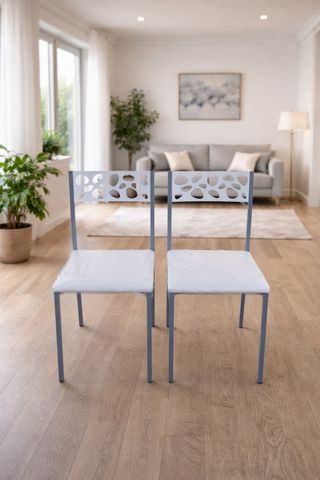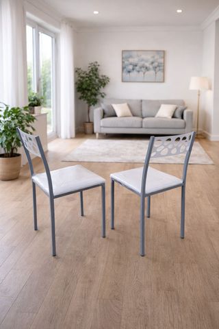 Modernas sillas de cocina con un diseño elegante. Muy poco uso. - Estructura metálica resistente. - Asiento tapizado en simil piel, fácil de limpiar. - Color gris y blanco.