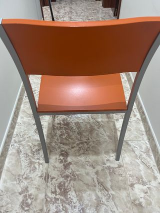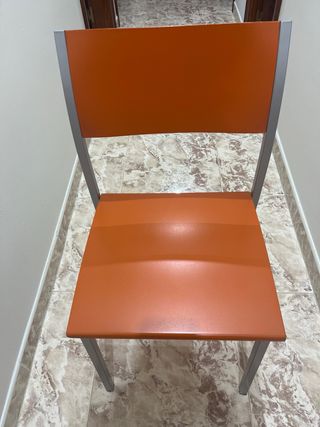 Dos sillas de cocina patas aluminio, respaldo y asiento madera, color naranja.