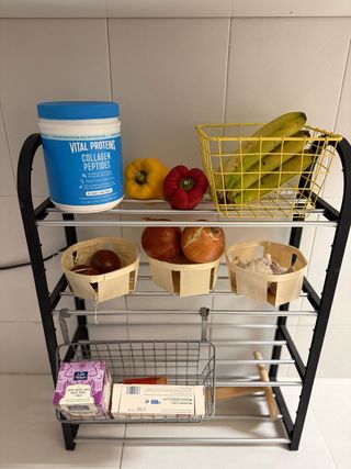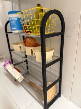 Práctico organizador de cocina con varios niveles para almacenar alimentos y otros utensilios. - Estructura principal en metal negro. REGALO !!! cestas de madera