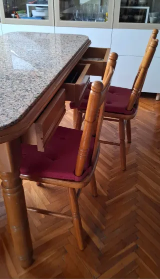 Conjunto de mesa de madera con 3 cajones y tablero de granito y cuatro sillas de madera para cocina o comedor. Las sillas tienen cojines en color rosa. - Tablero de mesa de granito. - Estructura de las sillas de madera. - Incluye 4 sillas. - Medidas de la mesa 150x70cm