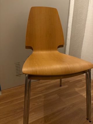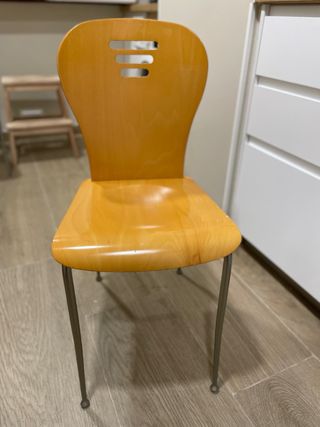 Conjunto de sillas de cocina con un diseño moderno y funcional. - Asiento y respaldo de madera. - Patas de metal plateado.