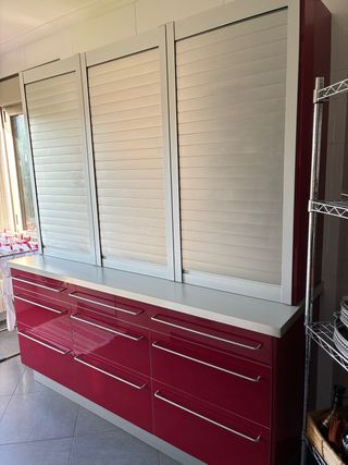 Mueble de cocina con diseño moderno y funcional. - Combinación de colores rojo guinda y gris metalizado - Estructura con cajones inferiores y persianas metálicas superiores. - Tiradores metálicos. Medidas: 3 bases de 60x60 con una sola encimera de 1,86 3 muebles de persiana de 60x40x120 que pueden ir sobre el mueble ó colgados de la pared dejando toda la meseta libre
