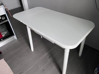 Mesa de cocina con 4 sillas las medidas abierta son 80x80 Cerrada son 80x40 En perfecto estado salvo pequeño desconchón que se puede apreciar en la foto Si estáis interesados solo en las sillas 10 euros cada una