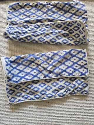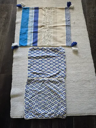 Conjunto de cojines en tonos azules y cremas, con un diseño moderno y elegante. 3 grandes (60x50) y 2 pequeños (30x40). 1 de los cocines grandes falta una borla por lo que bajo su precio. - Diseño a rayas y con motivos geométricos. - Adornos de borlas en las esquinas.