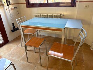 Conjunto de mesa de cocina con sobre de cristal y estructura de madera y metal y 3 sillas y 1 banqueta, 1m x 70cm, ampliable hasta 30 cm por cada lado. Buen estado; tiene un pequeño picotazo en el cristal - Diseño moderno y funcional. - Patas metálicas resistentes. - Tablero de cristal templado.