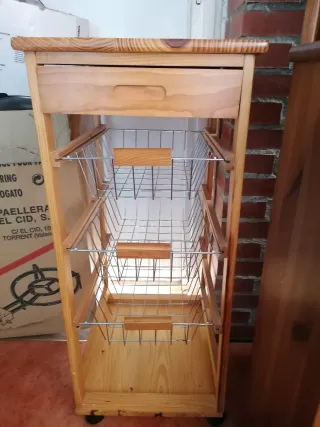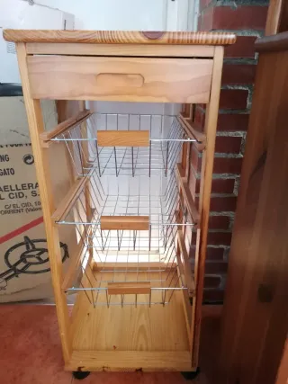 Carrito auxiliar de cocina con un diseño práctico y funcional. - Fabricado en madera. - Color beige. - Incluye ruedas para facilitar su movilidad. -tiene unos pequeños arañazos donde se ve en la última fotografía ,se puede pintar y queda como nuevo