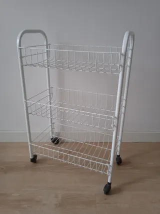 Carrito auxiliar con diseño moderno y funcional, ideal para organizar tu cocina o baño. - Estructura de metal resistente. - Bandejas de malla para ventilación. - Ruedas para fácil movilidad. Ref: 850-164v00wt