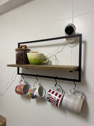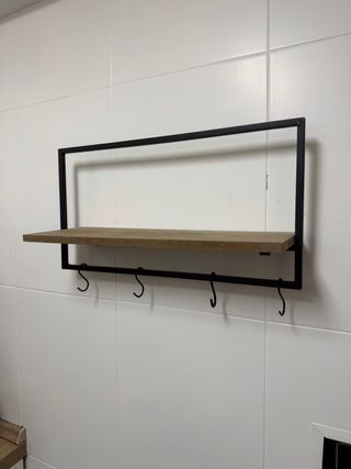 Estante de pared con un diseño moderno y funcional. Ideal para organizar tus objetos. - Combinación de madera y metal. - Marco exterior negro. - Incluye ganchos para colgar.