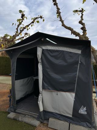 Tienda de cocina para camping de la marca Ticamo, modelo Cadaqués. Ideal para añadir un espacio extra a tu caravana o autocaravana. - Estructura resistente. - Fácil montaje y desmontaje. - Amplio espacio interior.