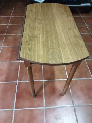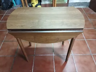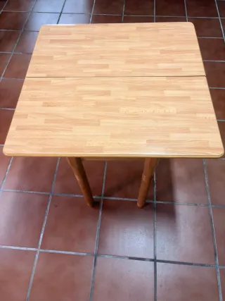 Mesa plegable de cocina en buen estado. Tiene dos taburetes. Madera de buena calidad. Abierta mide 85x90x80