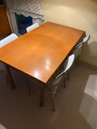Conjunto de mesa de cocina con cuatro sillas. - Mesa con sobre de madera y patas metálicas. - Sillas de plástico con estructura metálica.