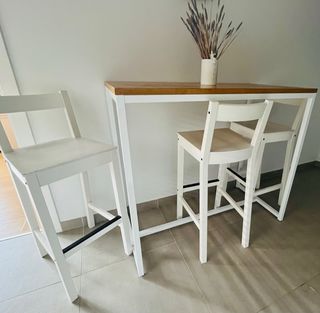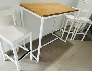 Conjunto de mesa alta de cocina, con las patas metálicas y el sobre de madera, de Maisons du Monde. Dimensiones: 120 cm largo x 60 cm ancho x 105 cm alto. La madera está un poco desgastada por el lateral, y levemente por la parte superior (ver fotos). - Incluye 3 taburetes de madera blanca, de Ikea, con reposapiés. Dimensiones: 100 cm de alto total, 70 cm de alto sin contar respaldo x 39 cm de ancho