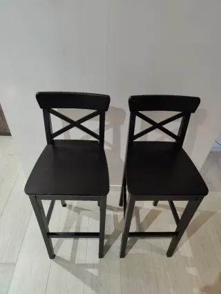 Conjunto de dos taburetes altos modelo Ingolf de Ikea. Su diseño clásico y robusto los hace perfectos para cualquier cocina o barra. - Estructura de madera maciza. - Diseño con respaldo cruzado. - Acabado en color negro.