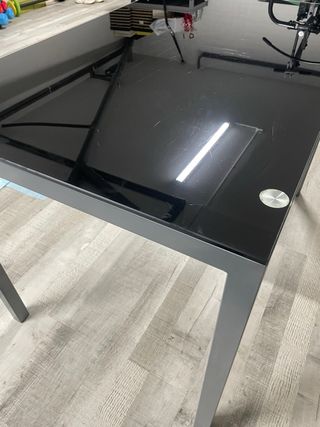 Mesa cocina o pequeño comedor. Mix cristal negro con marcas normales de uso. Base metalica en gris mate. 110 largo 70 ancho 75 alto ( no se envia por volumen y peso ) ( no se venden las sillas, solo mesa )