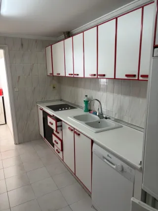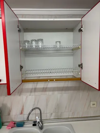 Cocina completa con 280cm de encimera. - Muebles de cocina blancos con detalles rojos. - Encimera de cocina blanca de 280cm de largo. - Electrodomésticos integrados (vitrocerámica, horno). - Fregadero doble. - Muebles de arriba de 60cm de alto. -Muebles de abajo de 70cm de alto. Muy bien estado de conservación. Lavavajillas no incluido.